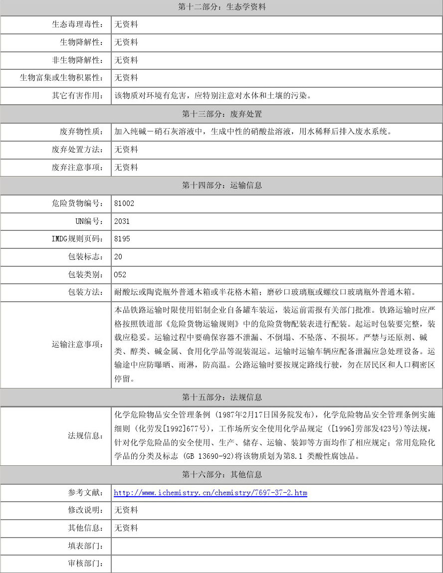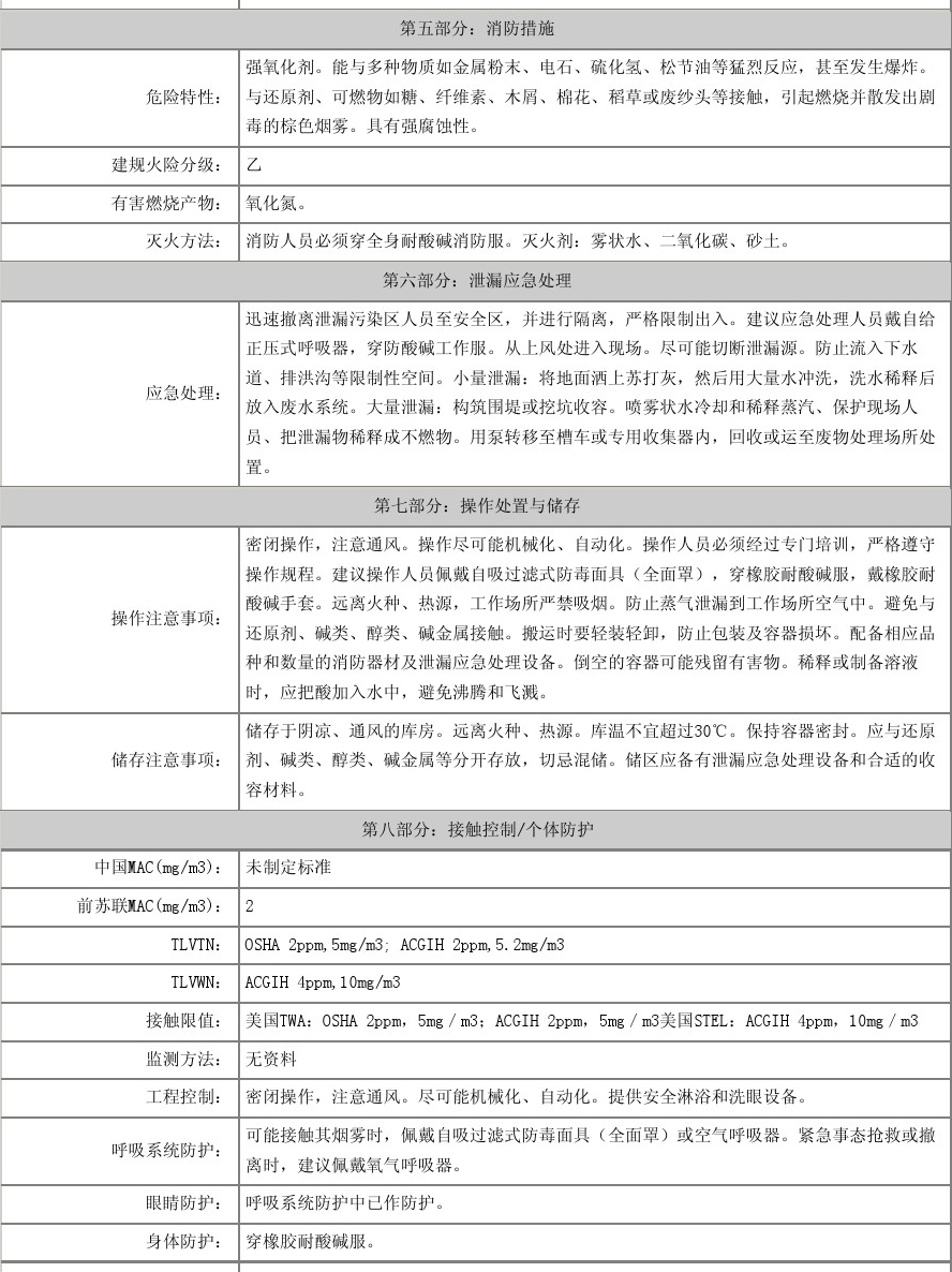 【物理性質(zhì)】純硝酸為無色透明液體,濃硝酸為淡黃色液體(溶有二氧化氮),正常情況下為無色透明液體。有窒息性刺激氣味。濃硝酸含量為68%左右,易揮發(fā),在空氣中產(chǎn)生白霧,是硝酸蒸汽與水蒸汽結(jié)合而形成的硝酸小液滴